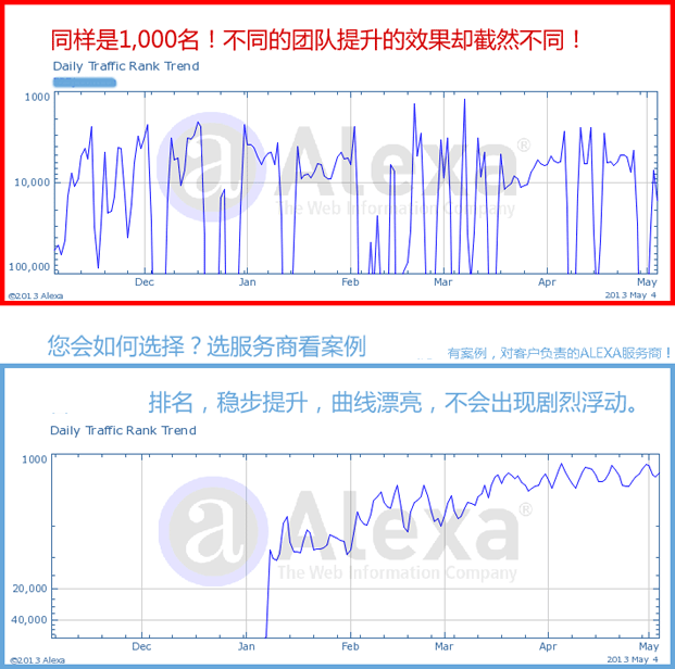 现在提升alexa 的市场有点混乱,我们要看的不是排名的数字,而是曲线,好的排名才能保证曲线的稳定!